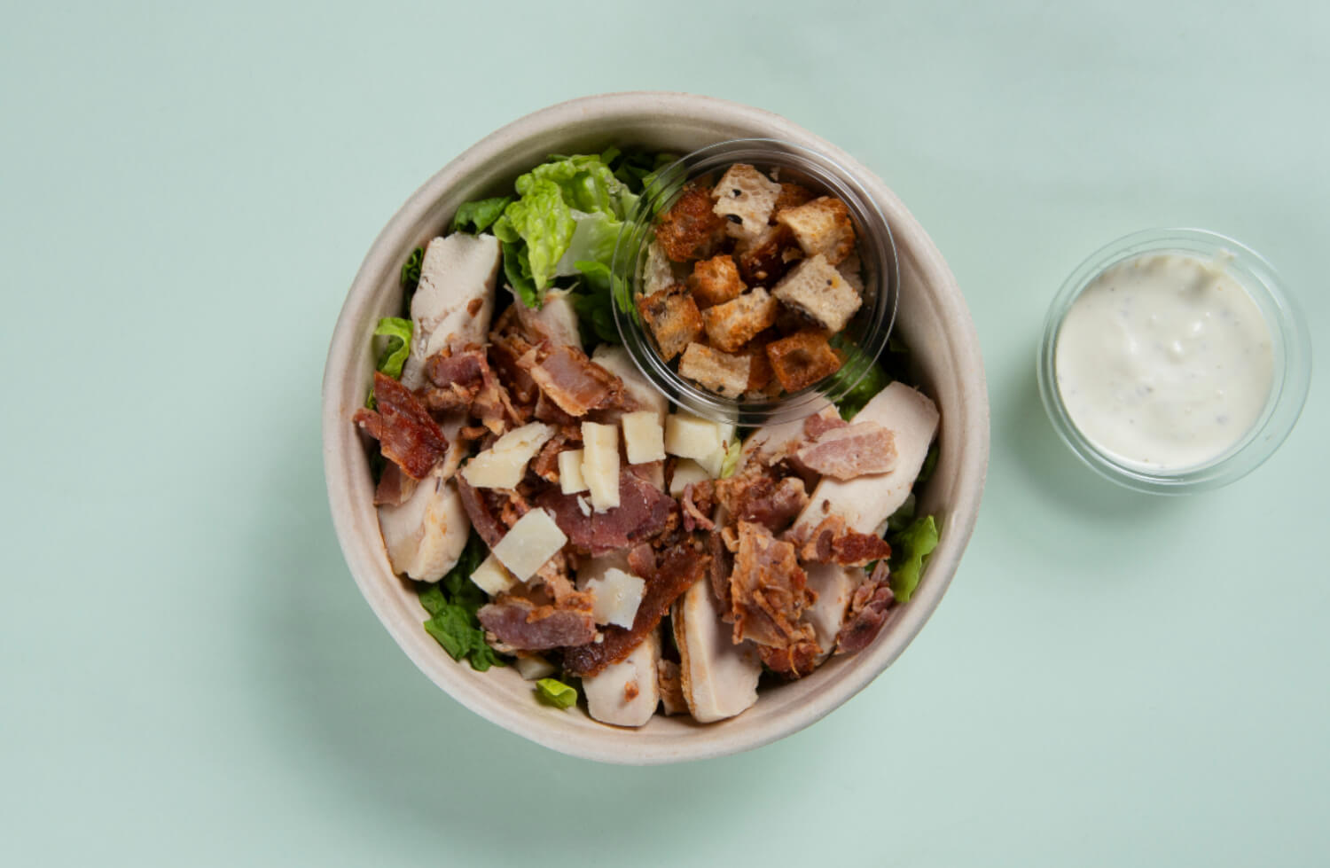 Klassisk Cæsarsalat med kylling, bacon og krutonger.